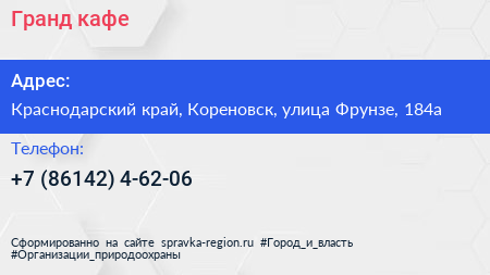 Гранд, кафе по адресу Краснодарский край, Кореновск, улица Фрунзе, 184а в дальнейшем Организация, размещена в следующих категориях: