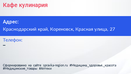 Кафе-кулинария по адресу Краснодарский край, Кореновск, Красная улица, 27 в дальнейшем Организация, размещена в следующих категориях:
