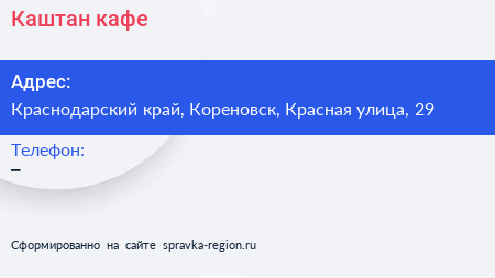 Каштан, кафе по адресу Краснодарский край, Кореновск, Красная улица, 29 в дальнейшем Организация, размещена в следующих категориях: