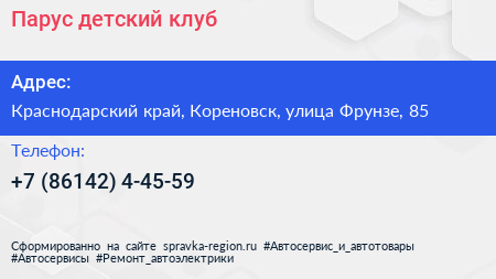 Парус, детский клуб по адресу Краснодарский край, Кореновск, улица Фрунзе, 85 в дальнейшем Организация, размещена в следующих категориях: