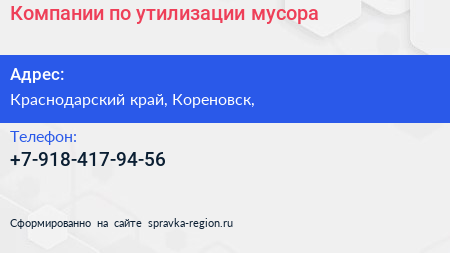 Компании по утилизации мусора по адресу Краснодарский край, Кореновск, в дальнейшем Организация, размещена в следующих категориях:
