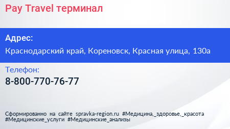 Pay.Travel, терминал по адресу Краснодарский край, Кореновск, Красная улица, 130а в дальнейшем Организация, размещена в следующих категориях: