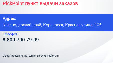PickPoint, пункт выдачи заказов по адресу Краснодарский край, Кореновск, Красная улица, 105 в дальнейшем Организация, размещена в следующих категориях: