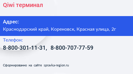 Qiwi, терминал по адресу Краснодарский край, Кореновск, Красная улица, 2г в дальнейшем Организация, размещена в следующих категориях:
