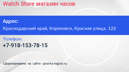 Watch Store, магазин часов по адресу Краснодарский край, Кореновск, Красная улица, 122 в дальнейшем Организация, размещена в следующих категориях: