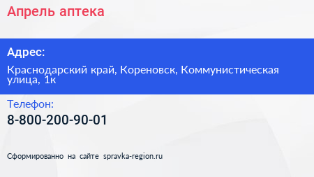 Апрель, аптека по адресу Краснодарский край, Кореновск, Коммунистическая улица, 1к в дальнейшем Организация, размещена в следующих категориях: