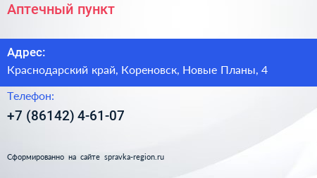 Аптечный пункт по адресу Краснодарский край, Кореновск, Новые Планы, 4 в дальнейшем Организация, размещена в следующих категориях: