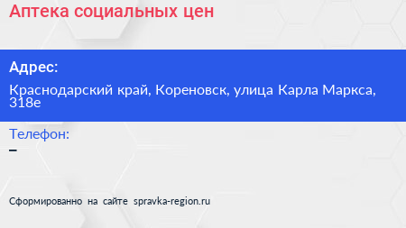 Аптека социальных цен по адресу Краснодарский край, Кореновск, улица Карла Маркса, 318е в дальнейшем Организация, размещена в следующих категориях:
