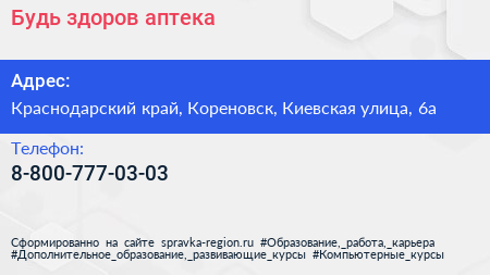 Будь здоров, аптека по адресу Краснодарский край, Кореновск, Киевская улица, 6а в дальнейшем Организация, размещена в следующих категориях: