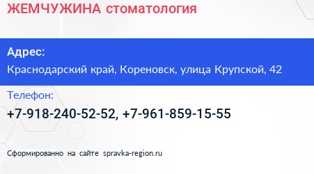 ЖЕМЧУЖИНА, стоматология по адресу Краснодарский край, Кореновск, улица Крупской, 42 в дальнейшем Организация, размещена в следующих категориях: