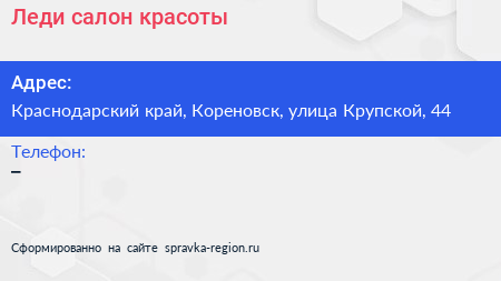 Леди, салон красоты по адресу Краснодарский край, Кореновск, улица Крупской, 44 в дальнейшем Организация, размещена в следующих категориях: