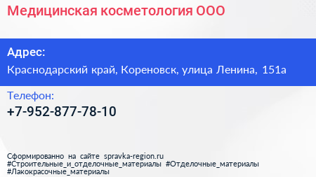 Медицинская косметология, ООО по адресу Краснодарский край, Кореновск, улица Ленина, 151а в дальнейшем Организация, размещена в следующих категориях:
