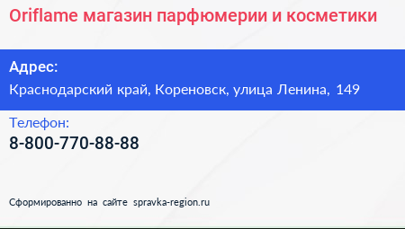 Oriflame, магазин парфюмерии и косметики по адресу Краснодарский край, Кореновск, улица Ленина, 149 в дальнейшем Организация, размещена в следующих категориях:
