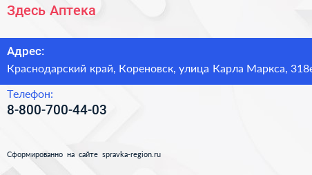 Здесь Аптека по адресу Краснодарский край, Кореновск, улица Карла Маркса, 318е в дальнейшем Организация, размещена в следующих категориях: