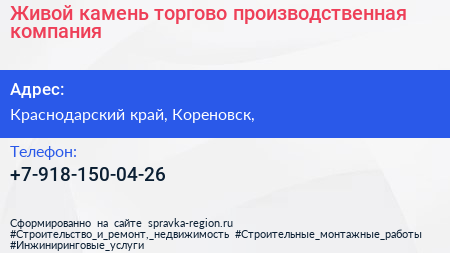 Живой камень, торгово-производственная компания по адресу Краснодарский край, Кореновск, в дальнейшем Организация, размещена в следующих категориях:
