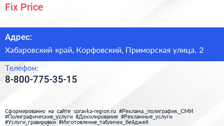 Fix Price по адресу Хабаровский край, Корфовский, Приморская улица, 2 в дальнейшем Организация, размещена в следующих категориях: