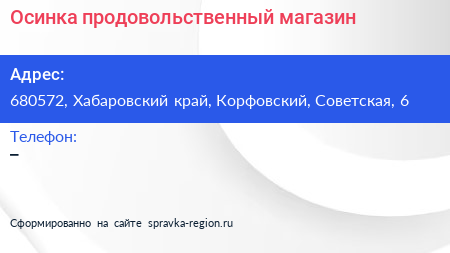 Осинка, продовольственный магазин по адресу 680572, Хабаровский край, Корфовский, Советская, 6 в дальнейшем Организация, размещена в следующих категориях:
