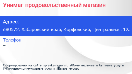 Унимаг, продовольственный магазин по адресу 680572, Хабаровский край, Корфовский, Центральная, 12а в дальнейшем Организация, размещена в следующих категориях: