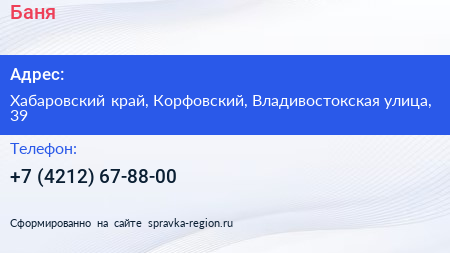 Баня по адресу Хабаровский край, Корфовский, Владивостокская улица, 39 в дальнейшем Организация, размещена в следующих категориях: