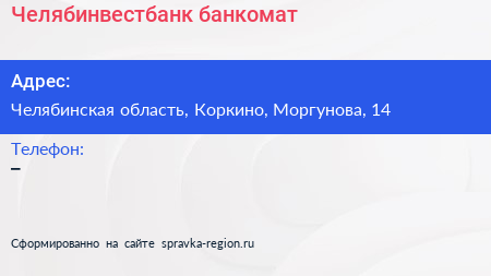 Челябинвестбанк, банкомат по адресу Челябинская область, Коркино, Моргунова, 14 в дальнейшем Организация, размещена в следующих категориях: