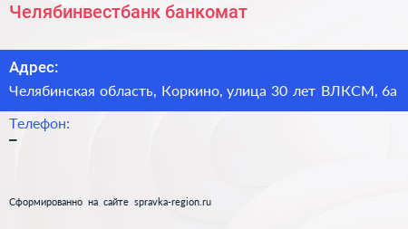 Челябинвестбанк, банкомат по адресу Челябинская область, Коркино, улица 30 лет ВЛКСМ, 6а в дальнейшем Организация, размещена в следующих категориях: