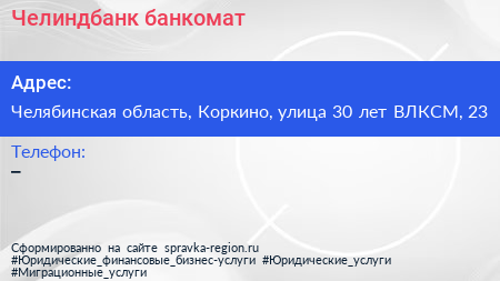 Челиндбанк, банкомат по адресу Челябинская область, Коркино, улица 30 лет ВЛКСМ, 23 в дальнейшем Организация, размещена в следующих категориях: