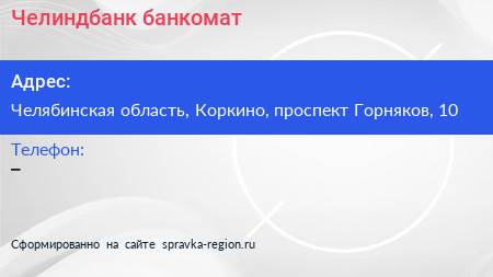 Челиндбанк, банкомат по адресу Челябинская область, Коркино, проспект Горняков, 10 в дальнейшем Организация, размещена в следующих категориях: