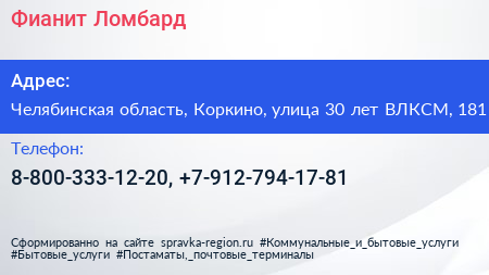 Фианит-Ломбард по адресу Челябинская область, Коркино, улица 30 лет ВЛКСМ, 181 в дальнейшем Организация, размещена в следующих категориях: