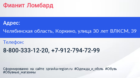 Фианит-Ломбард по адресу Челябинская область, Коркино, улица 30 лет ВЛКСМ, 39 в дальнейшем Организация, размещена в следующих категориях: