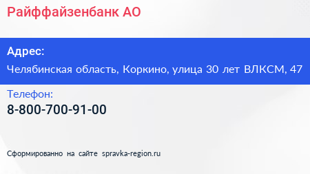 Райффайзенбанк, АО по адресу Челябинская область, Коркино, улица 30 лет ВЛКСМ, 47 в дальнейшем Организация, размещена в следующих категориях: