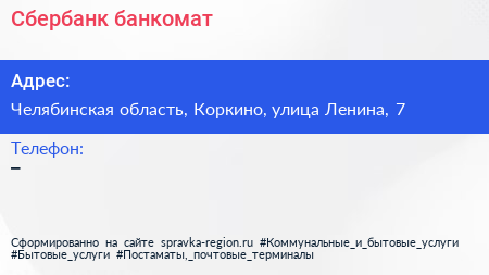 Сбербанк, банкомат по адресу Челябинская область, Коркино, улица Ленина, 7 в дальнейшем Организация, размещена в следующих категориях:
