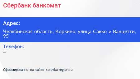 Сбербанк, банкомат по адресу Челябинская область, Коркино, улица Сакко и Ванцетти, 95 в дальнейшем Организация, размещена в следующих категориях: