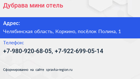 Дубрава, мини-отель по адресу Челябинская область, Коркино, посёлок Полина, 1 в дальнейшем Организация, размещена в следующих категориях: