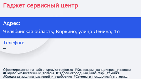 Гаджет, сервисный центр по адресу Челябинская область, Коркино, улица Ленина, 16 в дальнейшем Организация, размещена в следующих категориях: