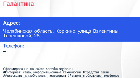 Галактика по адресу Челябинская область, Коркино, улица Валентины Терешковой, 28 в дальнейшем Организация, размещена в следующих категориях: