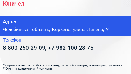 Юничел по адресу Челябинская область, Коркино, улица Ленина, 9 в дальнейшем Организация, размещена в следующих категориях: