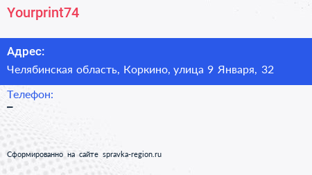 Yourprint74 по адресу Челябинская область, Коркино, улица 9 Января, 32 в дальнейшем Организация, размещена в следующих категориях: