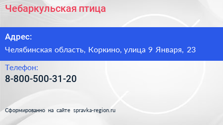 Чебаркульская птица по адресу Челябинская область, Коркино, улица 9 Января, 23 в дальнейшем Организация, размещена в следующих категориях: