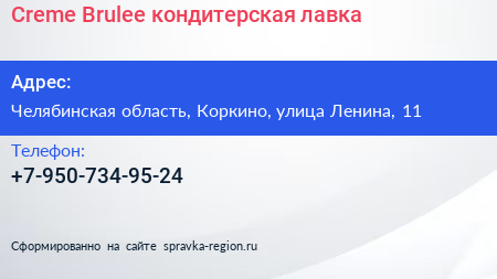 Creme Brulee, кондитерская лавка по адресу Челябинская область, Коркино, улица Ленина, 11 в дальнейшем Организация, размещена в следующих категориях:
