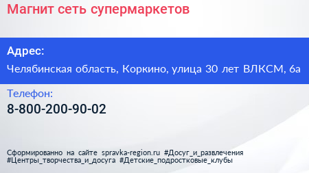 Магнит, сеть супермаркетов по адресу Челябинская область, Коркино, улица 30 лет ВЛКСМ, 6а в дальнейшем Организация, размещена в следующих категориях:
