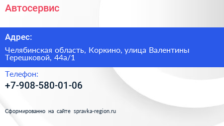 Автосервис по адресу Челябинская область, Коркино, улица Валентины Терешковой, 44а/1 в дальнейшем Организация, размещена в следующих категориях: