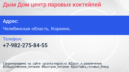 Дым Дом, центр паровых коктейлей по адресу Челябинская область, Коркино, в дальнейшем Организация, размещена в следующих категориях: