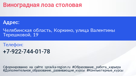 Виноградная лоза, столовая по адресу Челябинская область, Коркино, улица Валентины Терешковой, 19 в дальнейшем Организация, размещена в следующих категориях: