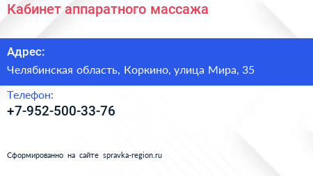 Кабинет аппаратного массажа по адресу Челябинская область, Коркино, улица Мира, 35 в дальнейшем Организация, размещена в следующих категориях: