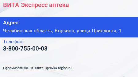 ВИТА Экспресс, аптека по адресу Челябинская область, Коркино, улица Цвиллинга, 1 в дальнейшем Организация, размещена в следующих категориях: