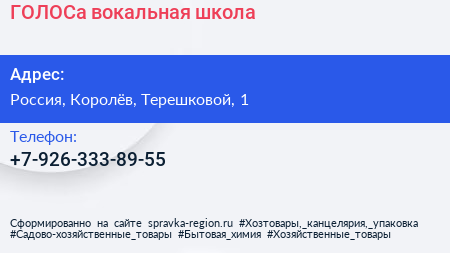 ГОЛОСа, вокальная школа по адресу Дворец культуры им. Калинина, 1, улица Терешковой, Подлипки, Королёв, городской округ Королёв, Московская область, Центральный федеральный округ, 141070, Россия в дальнейшем Организация, размещена в следующих категориях: