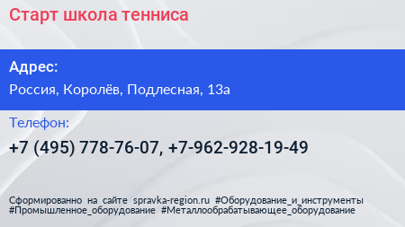 Старт, школа тенниса по адресу Пансионат с лечением КТРВ, 13А, Подлесная улица, Костино, Королёв, городской округ Королёв, Московская область, Центральный федеральный округ, 141071, Россия в дальнейшем Организация, размещена в следующих категориях: