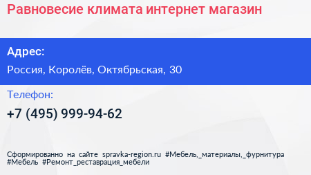 Равновесие климата, интернет-магазин по адресу Центральная Городская больница, Октябрьский бульвар, Комитетский Лес, Королёв, городской округ Королёв, Московская область, Центральный федеральный округ, 141077, Россия в дальнейшем Организация, размещена в следующих категориях: