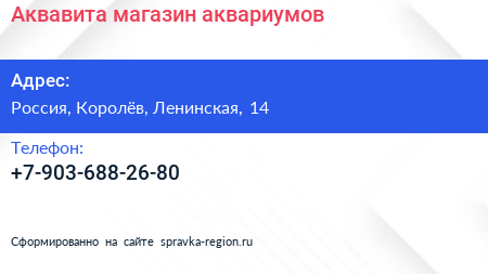 Аквавита, магазин аквариумов по адресу Королевский клуб здоровых людей "Витамин", 14, Ленинская улица, Юбилейный, Королёв, городской округ Королёв, Московская область, Центральный федеральный округ, 141090, Россия в дальнейшем Организация, размещена в следующих категориях: