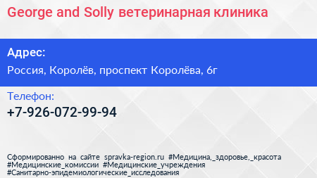 George and Solly, ветеринарная клиника по адресу Торговый центр "Ковчег", 6А, проспект Королёва, Новые Подлипки, Королёв, городской округ Королёв, Московская область, Центральный федеральный округ, 141077, Россия в дальнейшем Организация, размещена в следующих категориях: